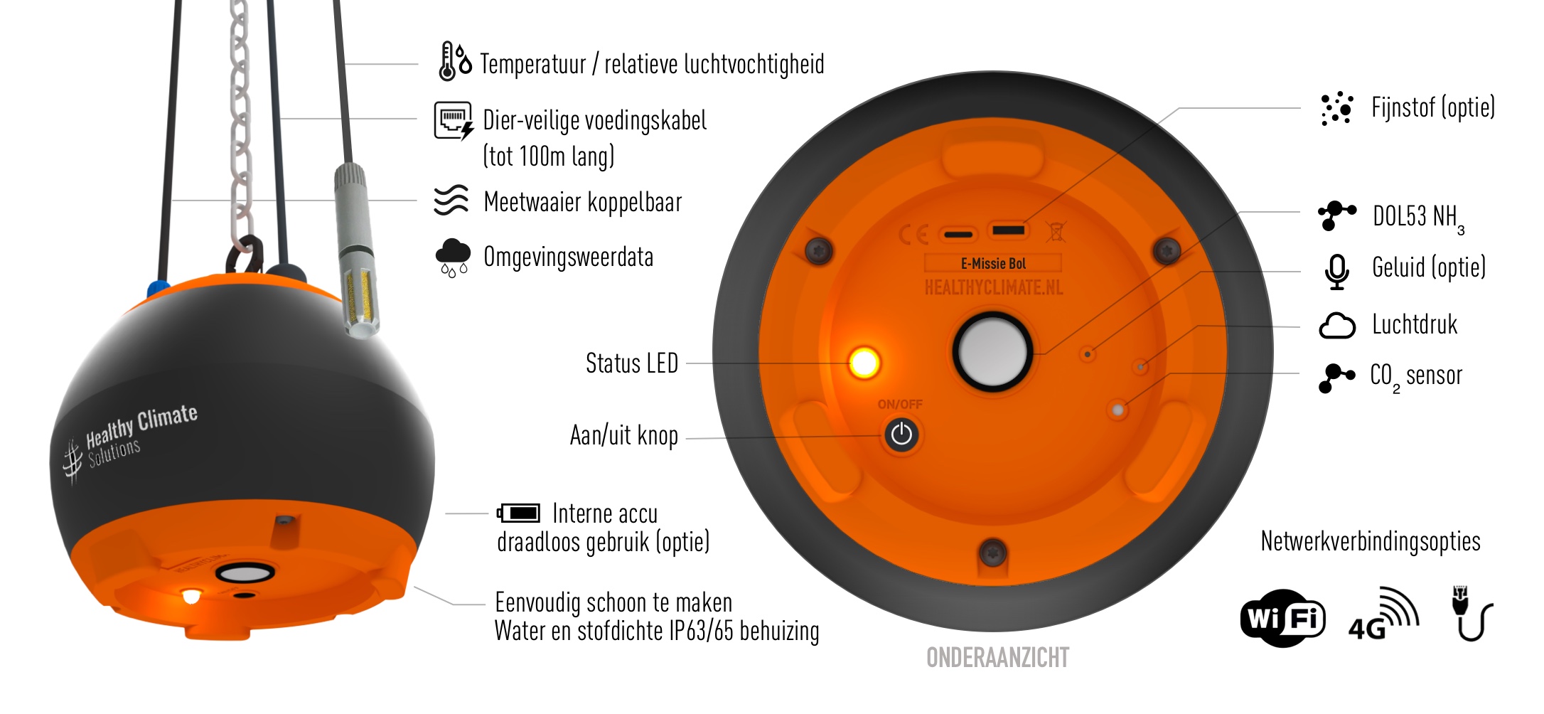 De E-Missie Bol (EMB) is het kleine broertje van de Healthy Climate Monitor (HCM). Dit model heeft geen camera en minder sensor opties, en is hierdoor voordeliger in de aanschaf. De software voor onze producten is hetzelfde: slim en gebruiksvriendelijk. De E-Missie Bol is uitstekend te gebruiken voor monitoring van luchtkwaliteit en/of stalemissies.